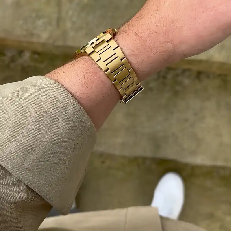 Wenn Deine Uhr mit Benzinstoffen, Farbverdünnern, Alkoholen, Kosmetiksprays, Nagellacken, Nagellackentfernern, Klebstoffen oder Farben / Entfärbungsmitteln in Berührung kommt, kann eine Qualitätsverschlechterung oder Beschädigung des Gehäuses oder dessen Dichtungen, des Armbandes oder anderer Komponenten der Uhr auftreten.